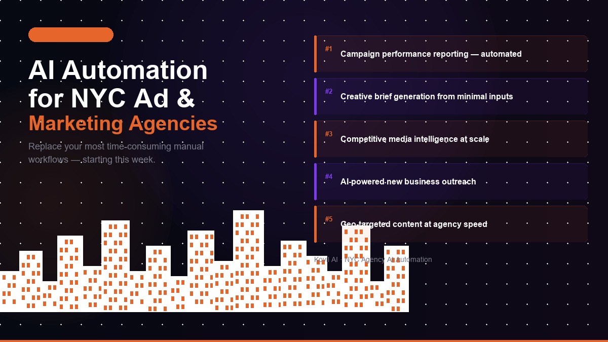 How New York City ad and marketing agencies are using AI automation in 2026 to scale output, cut operational overhead, and win more business, with ROI data, real NYC industry use cases, and a practical implementation roadmap.