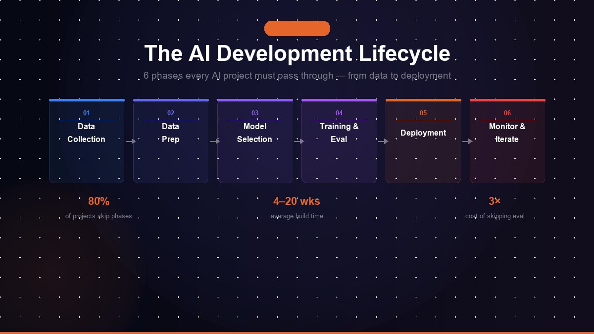Most AI projects fail not because of the technology, but because teams skip critical phases of the AI development lifecycle. Here is every stage explained, what goes wrong at each one, and how to run an AI project that actually ships.