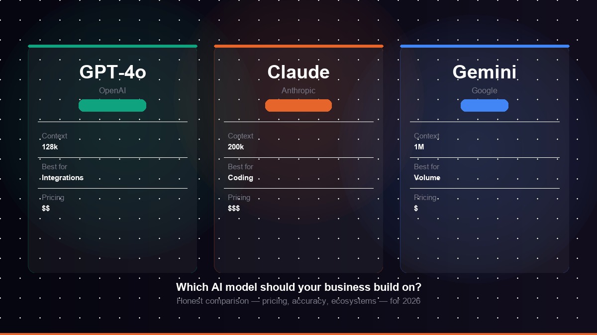 Claude leads on reasoning, GPT-4o on ecosystem, Gemini on cost. Here's which AI model your business should actually build on in 2026 — with pricing, accuracy, and vendor stability compared.