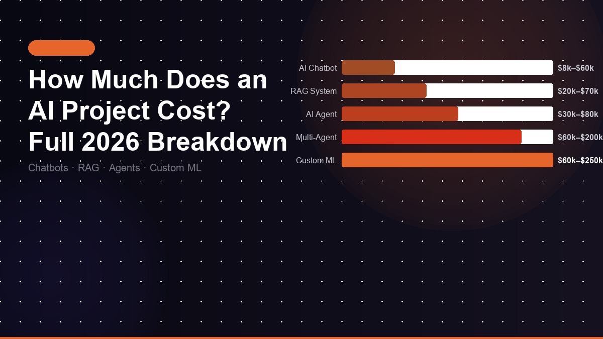 AI chatbots from $15k, RAG systems from $30k, AI agents from $40k. Here's the full 2026 cost breakdown — what drives the price, how to avoid surprise overruns, and how to get a fixed scope before you commit.