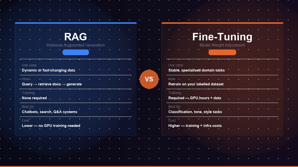 RAG and fine-tuning both make LLMs more useful for your business, but they solve different problems. Here's how to decide which is right for what you're building, with a cost comparison and decision framework.