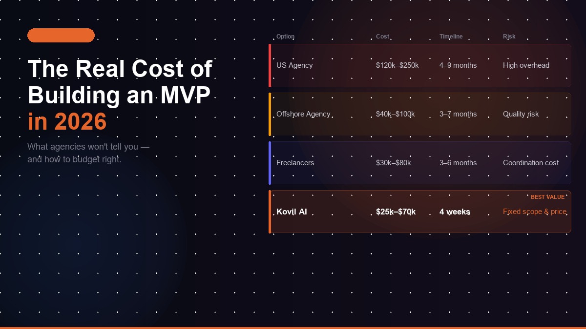 The question to ask isn't "how do I build the cheapest MVP?" The question is "how do I get the best outcome per dollar invested?" Those two questions have very different answers. See how Kovil AI prices a fixed-price AI project, scoped, built, and shipped with no surprises. And if you need to rescue an MVP that's already gone sideways, our App Rescue service is built for that.
