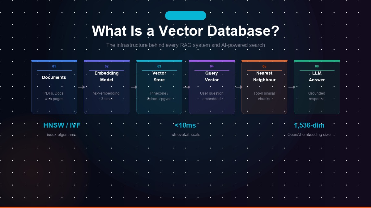 A vector database is a storage system specifically designed to store, index, and efficiently search vectors. The key operation it provides is nearest-neighbour search: given a query vector (the vectorised form of a user's question), find the stored vectors that are closest to it.